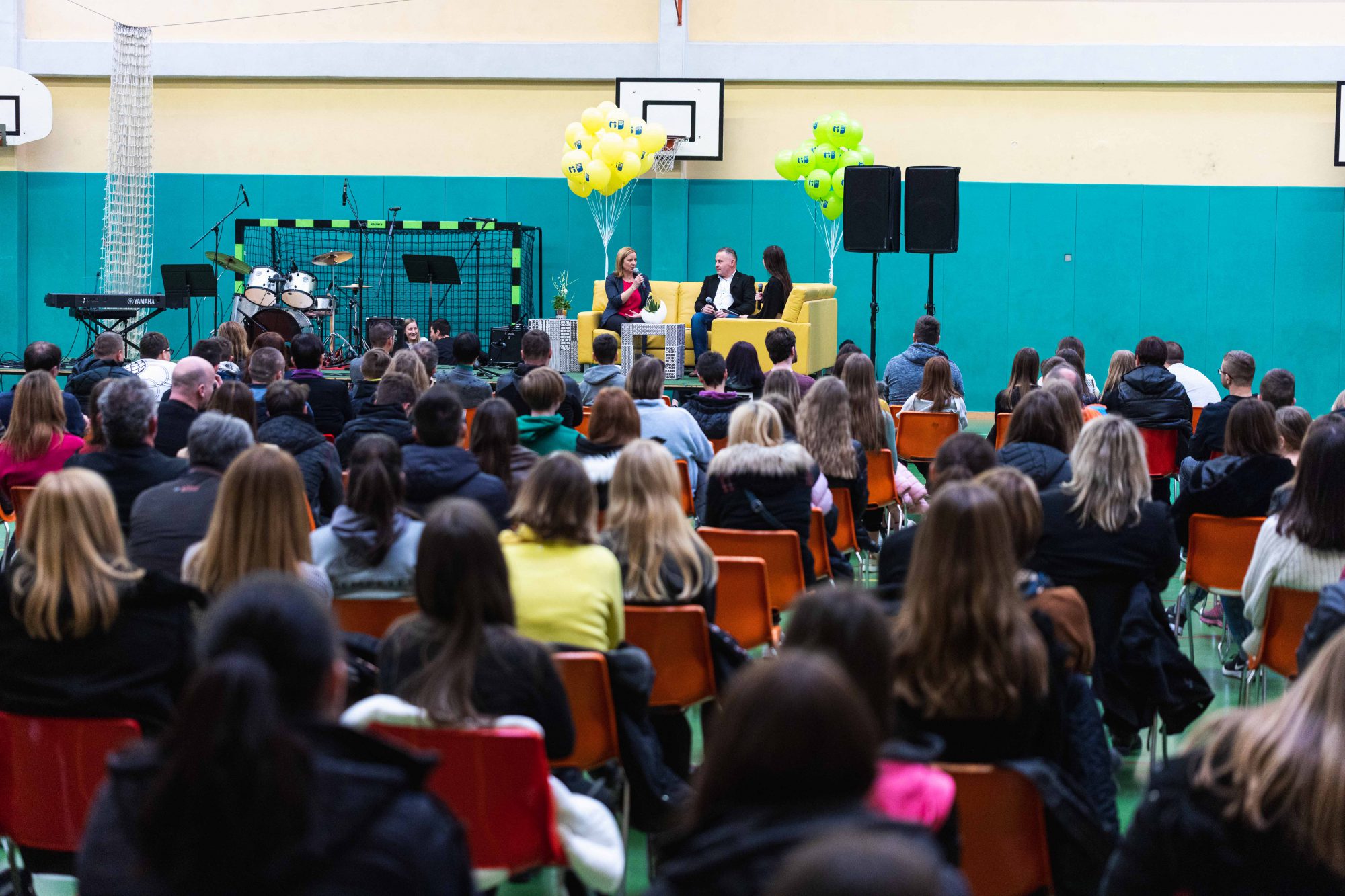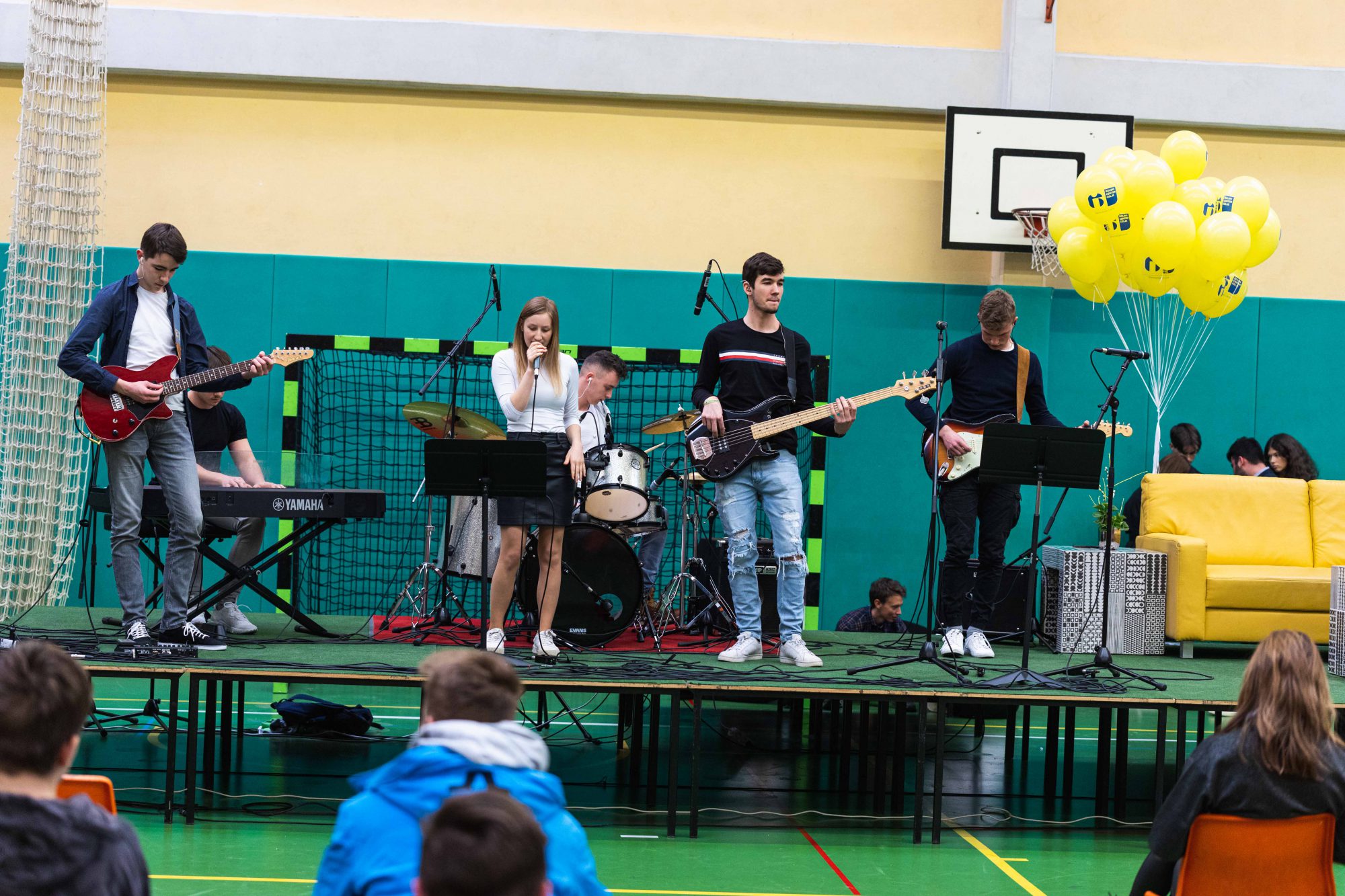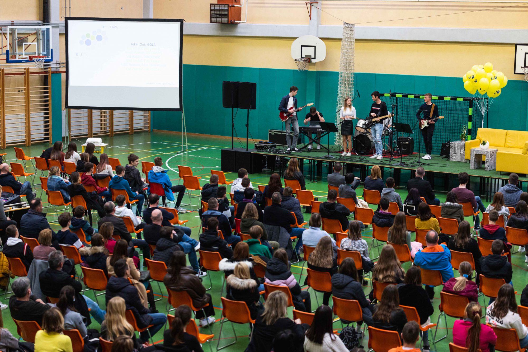 Najprej smo osnovnošolce in starše sprejeli v telovadnici, kjer smo skupaj z Gimnazijo Lava pripravili krajši kulturni program, na katerem je nastopil šolski band ERUPTION, skupaj z dijakoma gimnazijcema Borom in Ano pa sta program vodila Alen Andrejčič in Timeja Lipuš, oba iz K3A.