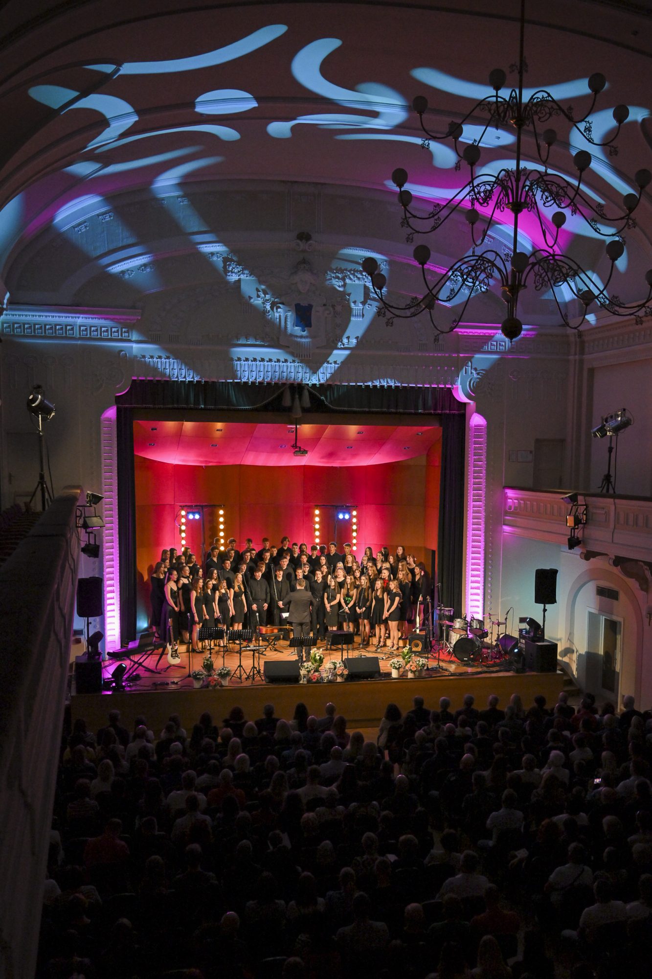 Zbor ŠC Celje se je nato znova vrnil na oder z lahkotnejšim programom slovenskih popevk Zemlja pleše in Na travniku – pri slednji se jim je na odru pridružil šolski bend Eruption. Vsi skupaj so pričarali nasmeh na obraze občinstva in dodali večeru igrivo noto.