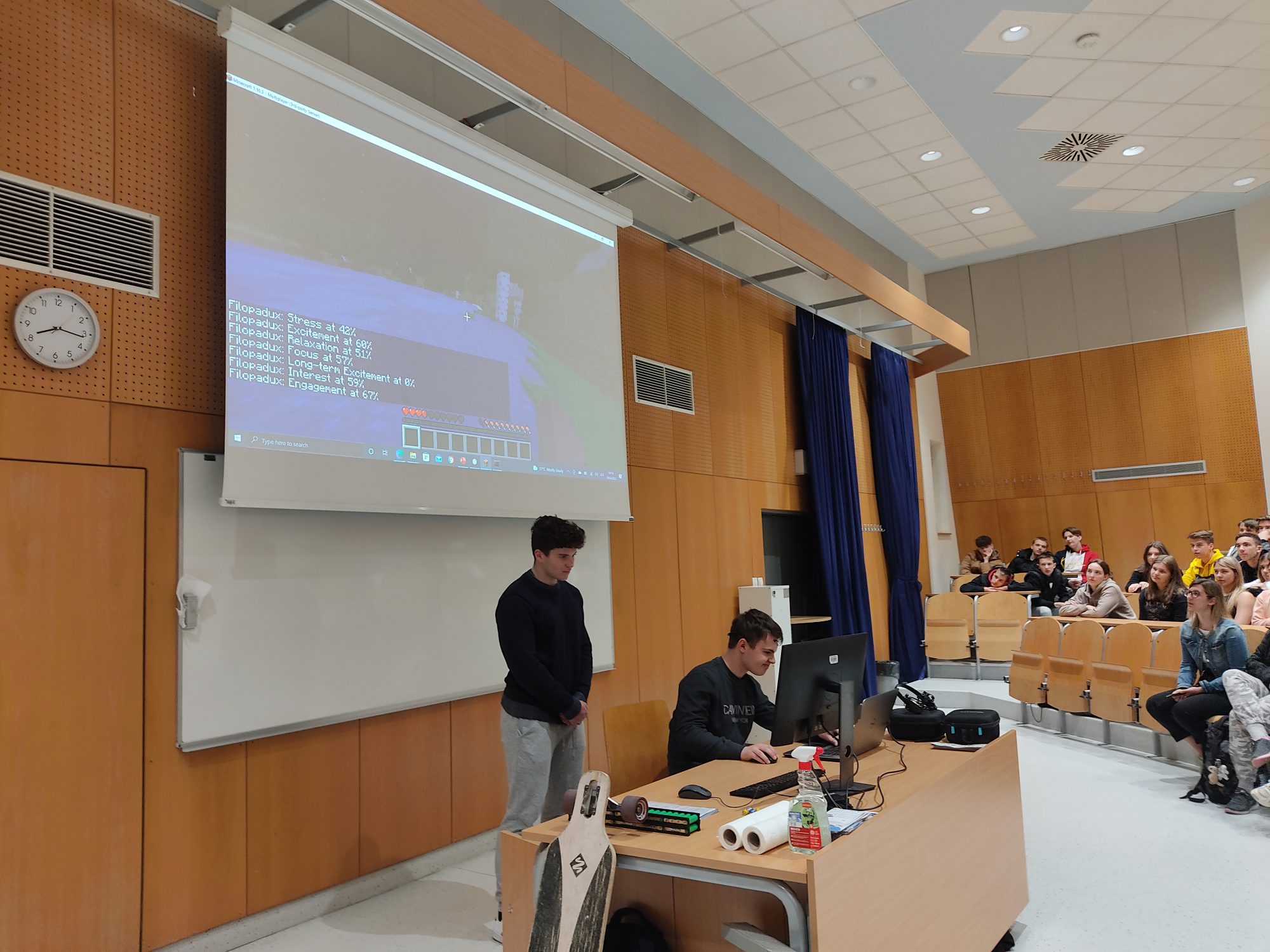 Predstavitve raziskovalnih nalog sta popestrila tudi Nejc Fludernik in Žan Pekošak, ki sta na letošnjem državnem tekmovanju elektro šol v Mariboru v kategoriji elektrotehnik osvojila 2. mesto.