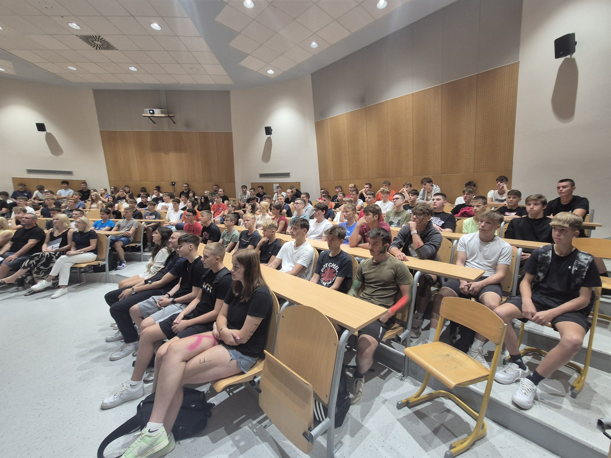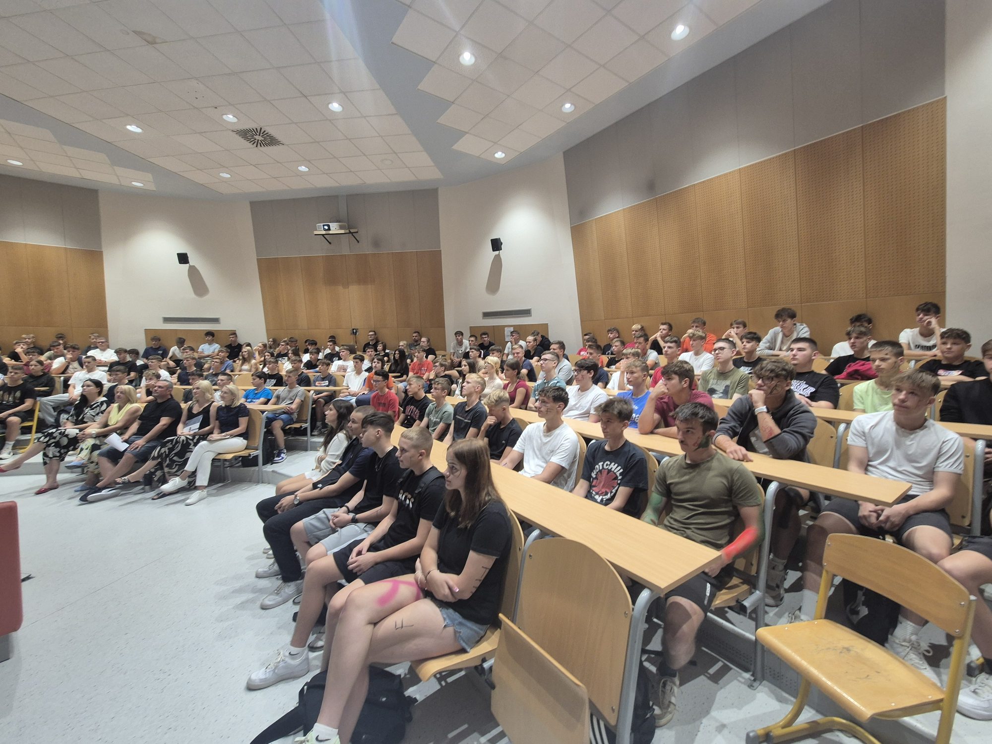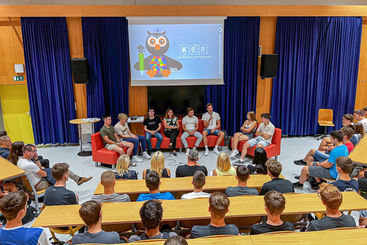 Dijake 1. letnika smo ob 8.00 pozdravili v predavalnici B12, kjer smo pripravili pogovor z dijaki 4. letnika (Aljaž Žogan, Aleksander Avžner, Žiga Hrup, Špela Vnuk) in 3 dijaki (Jernej Bizjak, Lan Stokavnik, Maj Zabukovnik), ki se z oktobrom odpravljajo na študentsko pot. Naši gosti so dijakom predstavili šolo in številne možnosti, ki jih poleg pouka imajo dijaki na Srednji šoli za kemijo, elektrotehniko in računalništvo. Predstavili so sodelovanje na mednarodnih projektih, krožkih, nadstandardne strokovne ekskurzije, možnost opravljanja prakse (PUD-a) v tujini, raziskovalno dejavnost. Iskreno so povedali, da so v šoli kdaj naleteli tudi na težke trenutke, vendar se z delom, vztrajnostjo in dobrim sodelovanjem vse zmore. Pogovor, ki ga je vodila ravnateljica dr. Anita Laznik, je bil poseben tudi zaradi tega, ker so dijake pozdravili Jernej, Lan in Maj, ki so junija 2024 prejeli najvišje šolsko priznanje zlati vektor.
